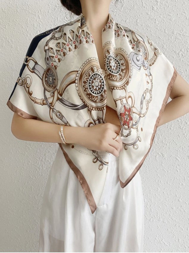 復古鏈條印花,展現低調奢華風範。這款女士方形頭巾以絲滑親膚面料製成,印有經典鏈條與圖騰圖案,充滿法式名媛氣息。無論繫於頸間、綁於頭髮、包在手袋上,都是一抹亮眼的穿搭點綴。